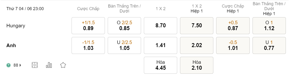 Tỉ lệ kèo Hungary vs Anh