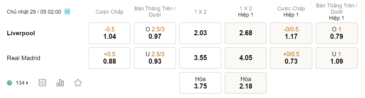 Tỉ lệ kèo Liverpool vs Real Madrid