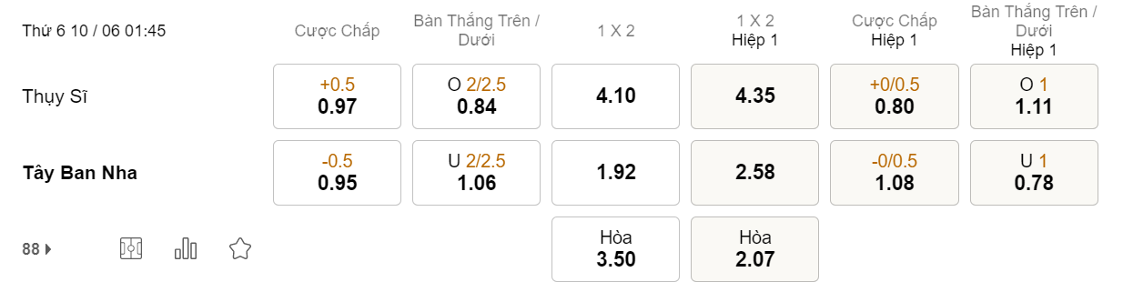 Tỉ lệ kèo Thụy Sĩ vs Tây Ban Nha