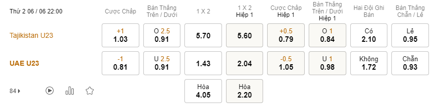 Soi kèo hiệp 1 U23 Tajikistan vs U23 UAE: 0.79*0.5*1.05